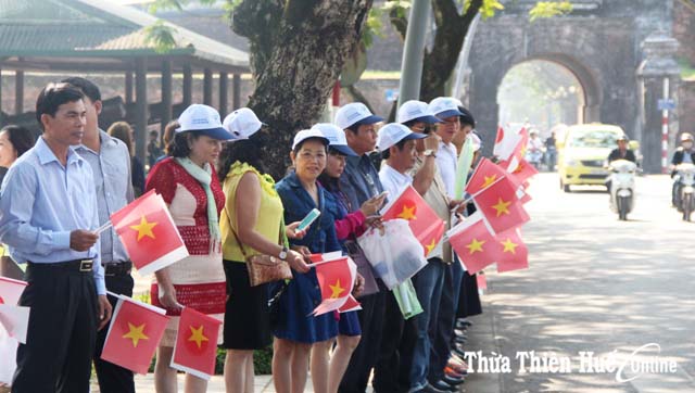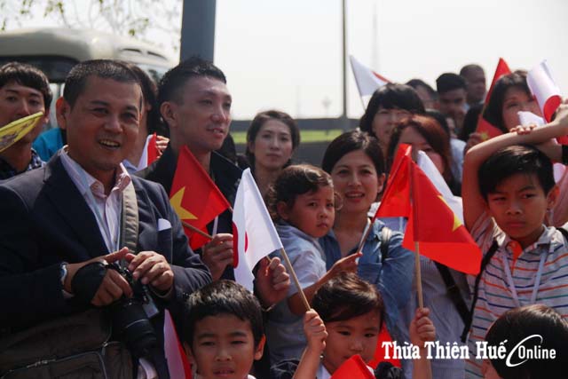 Người dân và du khách cầm cờ Việt – Nhật đứng chào đón Nhật Hoàng cùng Hoàng hậu đến thăm Đại Nội.