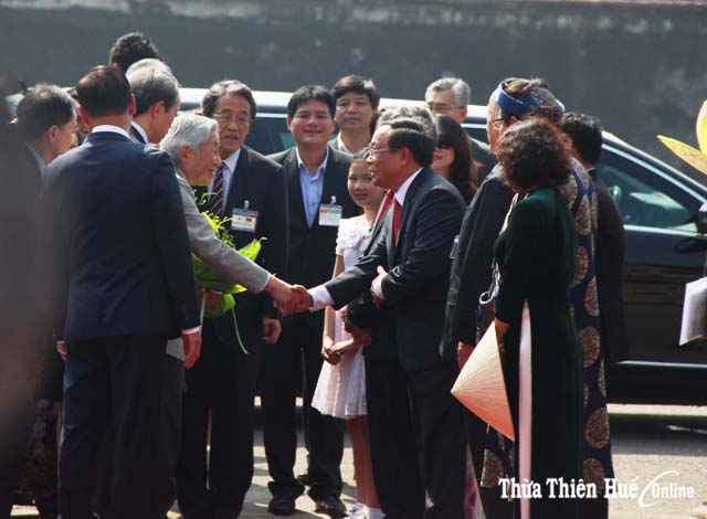 Chủ tịch UBND tỉnh Nguyễn Văn Cao chào đón Nhật Hoàng và đoàn tháp tùng trước khi tiến vào Đại Nội.