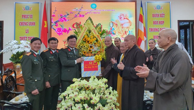 Qua đó, Đại tá Nguyễn Thanh Tuấn đã tặng lẵng hoa, gửi lời chúc mừng tốt đẹp nhất tới quý hòa thượng, thượng tọa, đại đức, tăng ni, đồng bào phật tử trong tỉnh đón một cái Tết Nguyên đán Quý Mão 2023 mạnh khỏe, an lạc, cát tường.