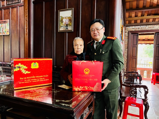 Dịp này, Đại tá Nguyễn Thanh Tuấn và đoàn công tác của Công an tỉnh cũng đã đến thăm hỏi và tặng quà chúc tết thân nhân gia đình Anh hùng liệt sĩ Lê Văn Trĩ, xã Vinh Thái (nay là xã Phú Gia, huyện Phú Vang).