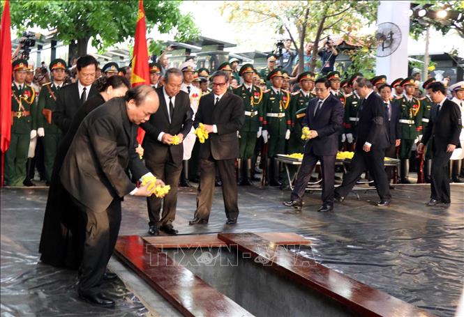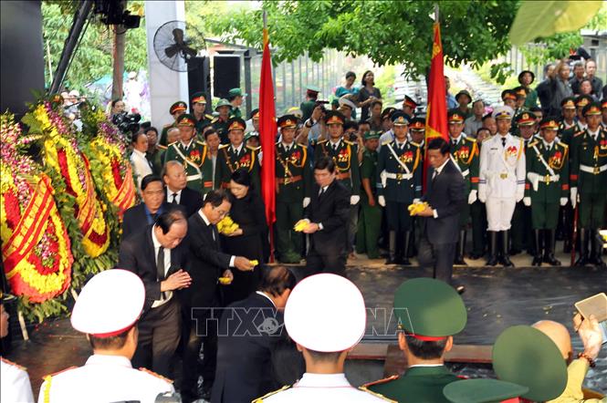Các đồng chí Lãnh đạo Đảng và Nhà nước thực thực hiện nghi thức an táng, rải hoa lên linh cữu Đại tướng Lê Đức Anh. Ảnh: Mạnh Linh/TTXVN