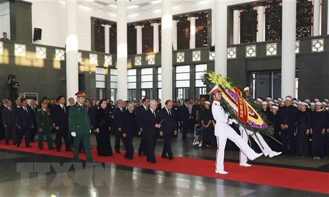 Đoàn Ban Chấp hành Trung ương Đảng Cộng sản Việt Nam, do đồng chí Nguyễn Phú Trọng, Tổng Bí thư Ban Chấp hành Trung ương Đảng làm Trưởng đoàn, viếng đồng chí Đỗ Mười. (Ảnh: TTXVN)