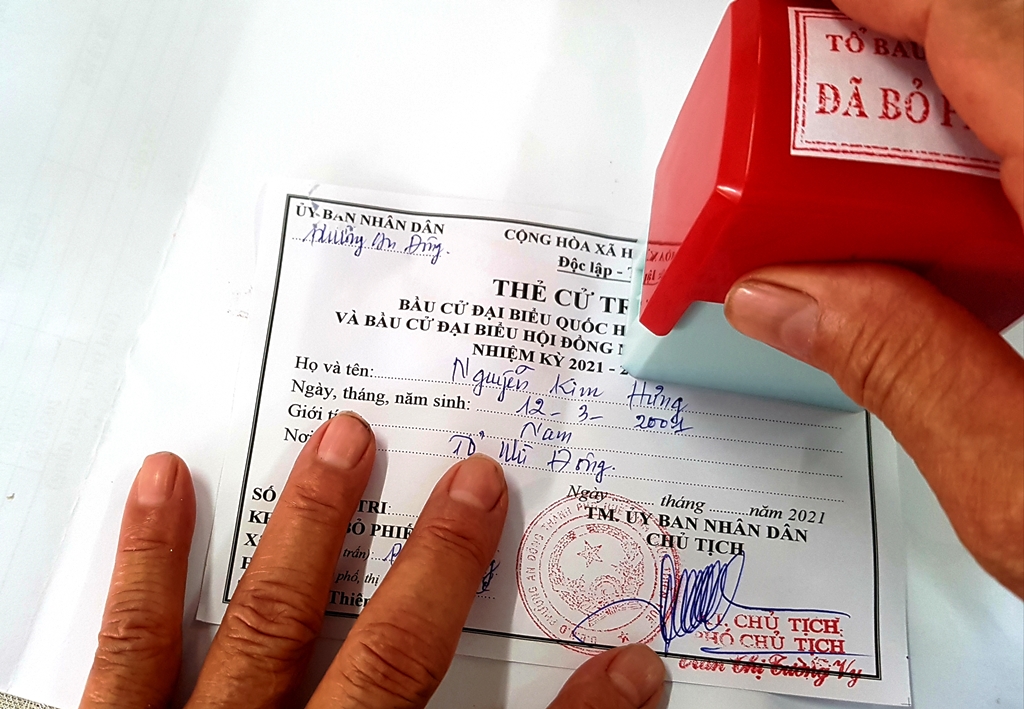 Sau khi bỏ phiếu, các cử tri sẽ được đóng dấu lên thẻ cử tri. Ảnh: Nhật Minh