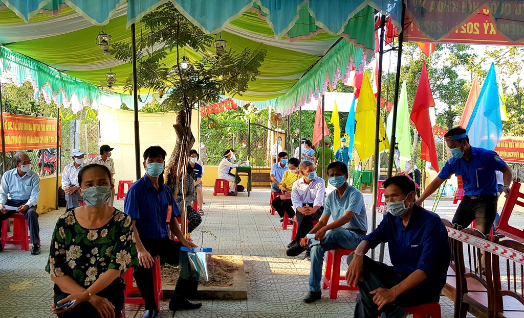Cử tri được yêu cầu ngồi giãn cách theo quy định. Ảnh: Nhật Minh