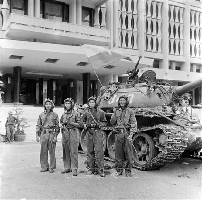 Khoảnh khắc lịch sử xe tăng Quân giải phóng tiến vào Dinh Độc Lập, trưa 30/4/1975, đánh dấu thắng lợi trọn vẹn của chiến dịch Hồ Chí Minh lịch sử, đỉnh cao của cuộc Tổng tiến công và nổi dậy mùa Xuân năm 1975, kết thúc vẻ vang cuộc kháng chiến chống Mỹ cứu nước kéo dài hơn hai thập niên (1954 - 1975), giải phóng hoàn toàn miền Nam, thống nhất đất nước. Ảnh: Trần Mai Hưởng/TTXVN