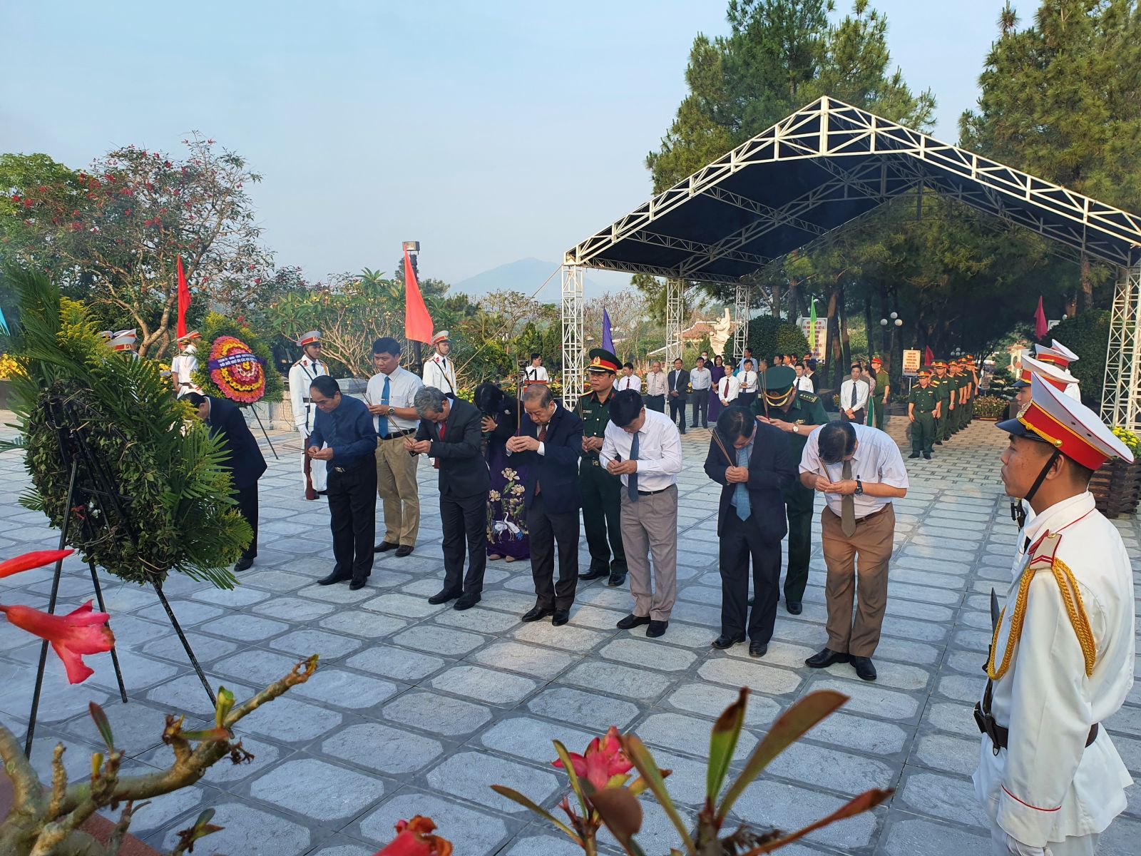 Sau lễ dâng hương và đặt vòng hoa, các đại biểu dành một phút mặc niệm tưởng nhớ những người con ưu tú của quê hương, đất nước đã không tiếc máu xương hy sinh vì sự nghiệp đấu tranh giải phóng dân tộc, vì tự do, hạnh phúc của Nhân dân.