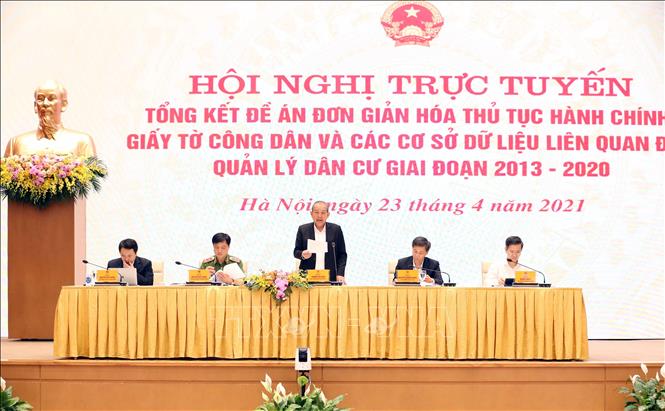 Hội nghị trực tuyến toàn quốc tổng kết Đề án tổng thể đơn giản hóa thủ tục hành chính, giấy tờ công dân và các cơ sở dữ liệu liên quan đến quản lý dân cư giai đoạn 2013 - 2020 (Đề án 986), diễn ra ngày 23/4, tại trụ sở Chính phủ và kết nối tới 63 điểm cầu trên toàn quốc.