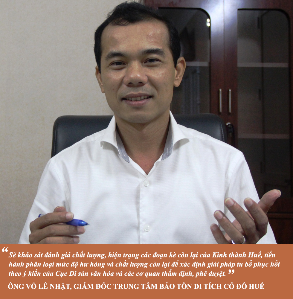 Một khó khăn khác, hồ sơ dữ liệu công trình để nghiên cứu không còn đầy đủ, chủ yếu là dựa vào hiện trạng và kết quả thám sát, khảo cổ công trình. Giải pháp tu bổ, gia cố phải đảm bảo đồng bộ, đặc biệt với các đoạn kè cần tu bổ phục hồi lại hoàn toàn. “Quá trình trùng tu, phục hồi, sẽ ưu tiên những hạng mục hư hỏng nặng trước rồi đến những hạng mục có khả năng phát huy giá trị, phục vụ du lịch, chỉnh trang cảnh quan đô thị”, ông Nhật phân tích.