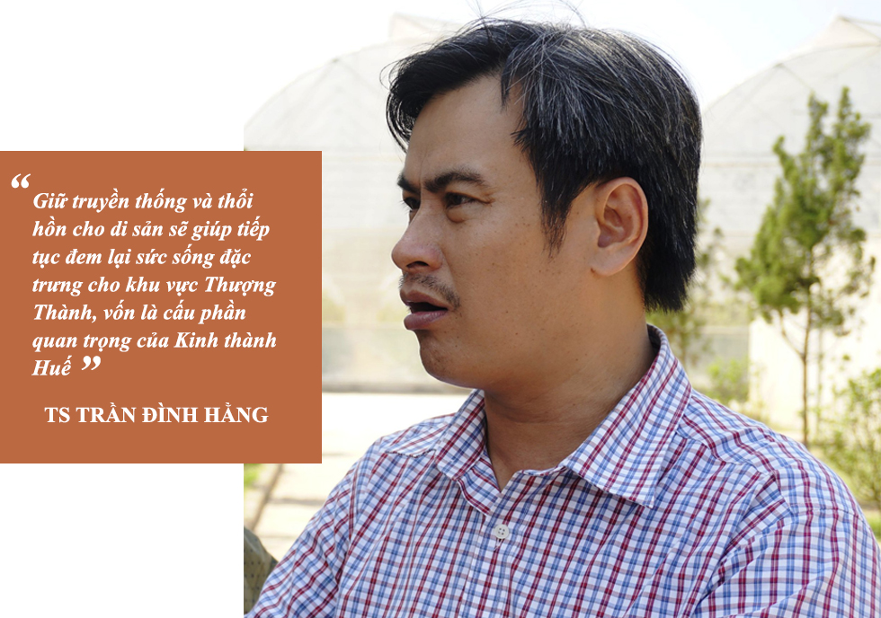 “Giữ truyền thống và thổi hồn cho di sản sẽ giúp tiếp tục đem lại sức sống đặc trưng cho khu vực Thượng Thành, vốn là cấu phần quan trọng của Kinh thành Huế”, TS. Hằng nêu quan điểm cho rằng đã đến lúc cần phải thực hiện chủ trương xã hội hóa trong việc nghiên cứu, trùng tu và phát huy giá trị di tích gắn liền du lịch trong vai trò là xây dựng những không gian, những điểm đến đặc hữu Huế.