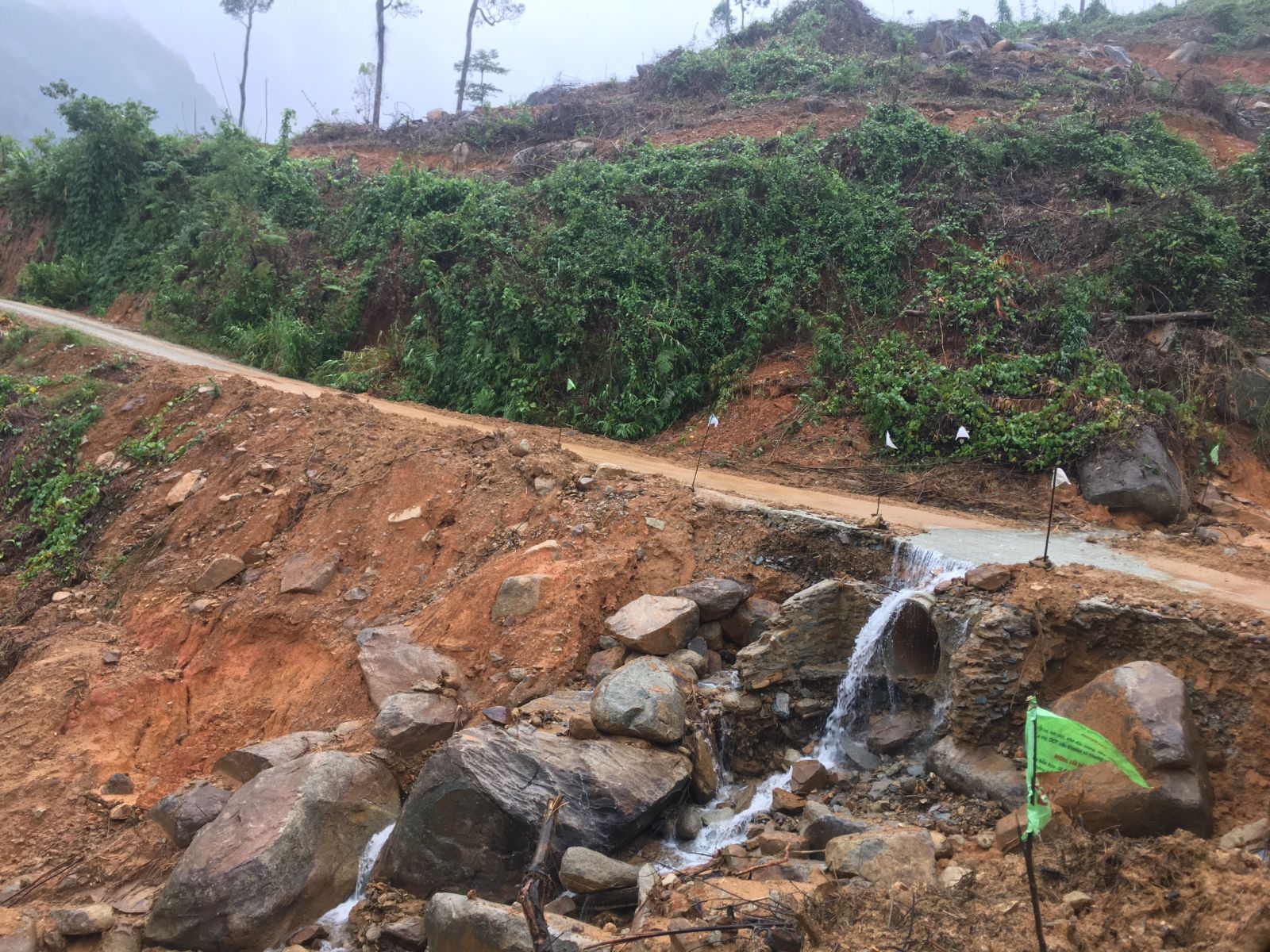 Các ngầm tràn vẫn chưa kè, rọ đá được do đoạn tuyến km12+100 trên đường 71 bị sạt lở bay hoàn toàn lòng đường nên xe chở đá, vật tư vào xử lý các ngầm tràn chưa di chuyển qua được.