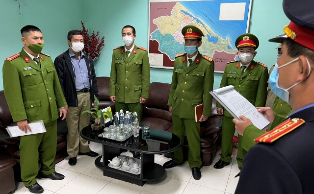 Cơ quan Cảnh sát điều tra Công an tỉnh đọc lệnh khởi tố, bắt tạm giam ông Hoàng Văn Đức (thứ 2, bên trái sang)
