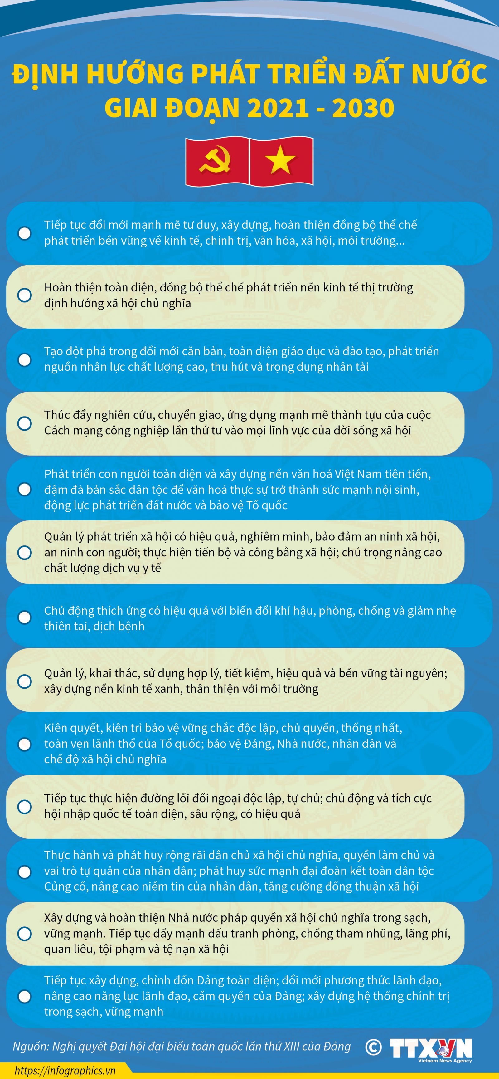 Đại hội đại biểu toàn quốc lần thứ XIII Đảng Cộng sản Việt Nam đã đề ra các định hướng lớn bao quát những vấn đề phát triển quan trọng của đất nước trong giai đoạn 2021-2030.