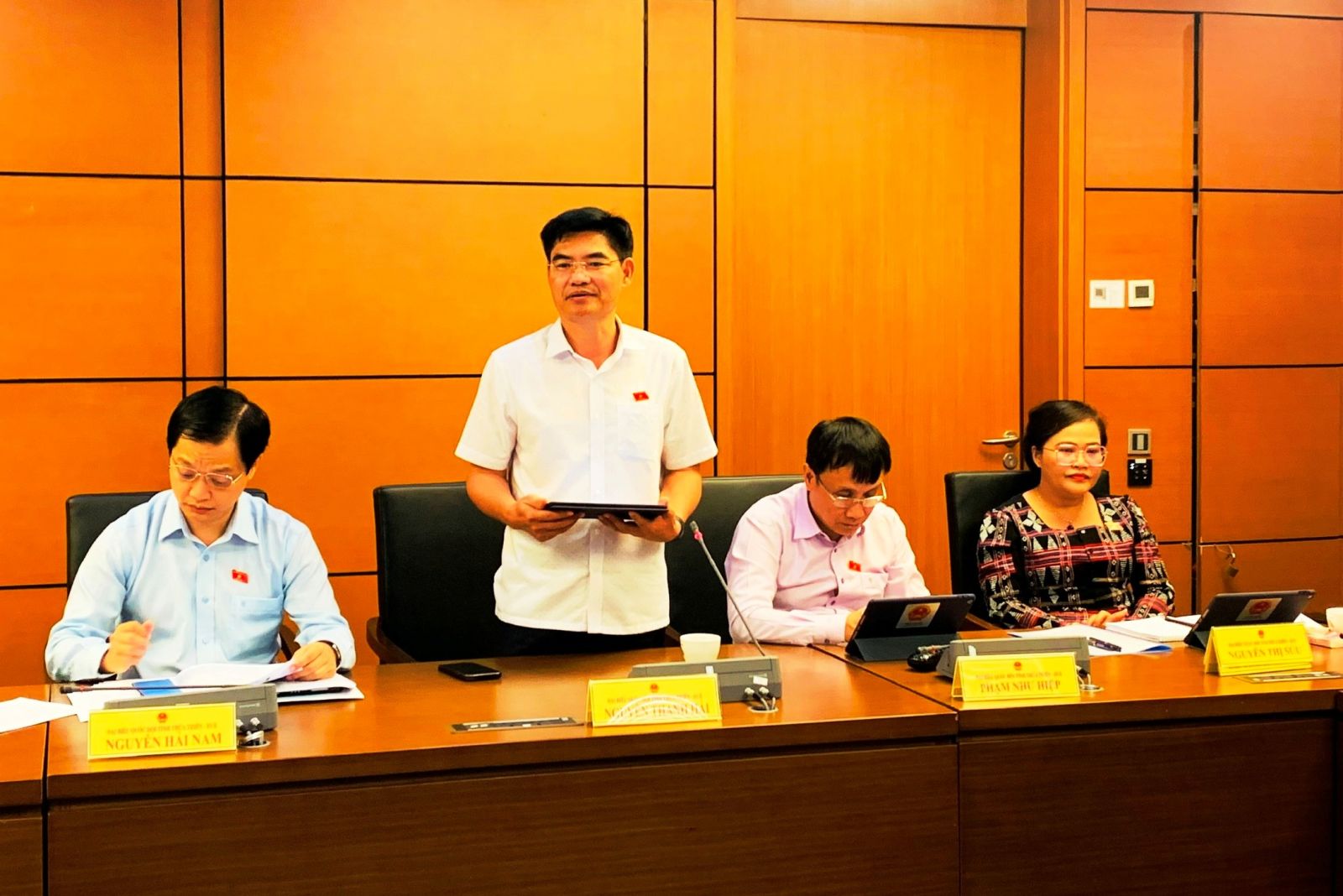 Các thành viên của Đoàn ĐBQH tỉnh tham gia thảo luận (Trong ảnh: Đại biểu Nguyễn Thanh Hải băn khoăn về tiêu chí để xác định một biển số đẹpẢnh: Đoàn ĐBQH tỉnh