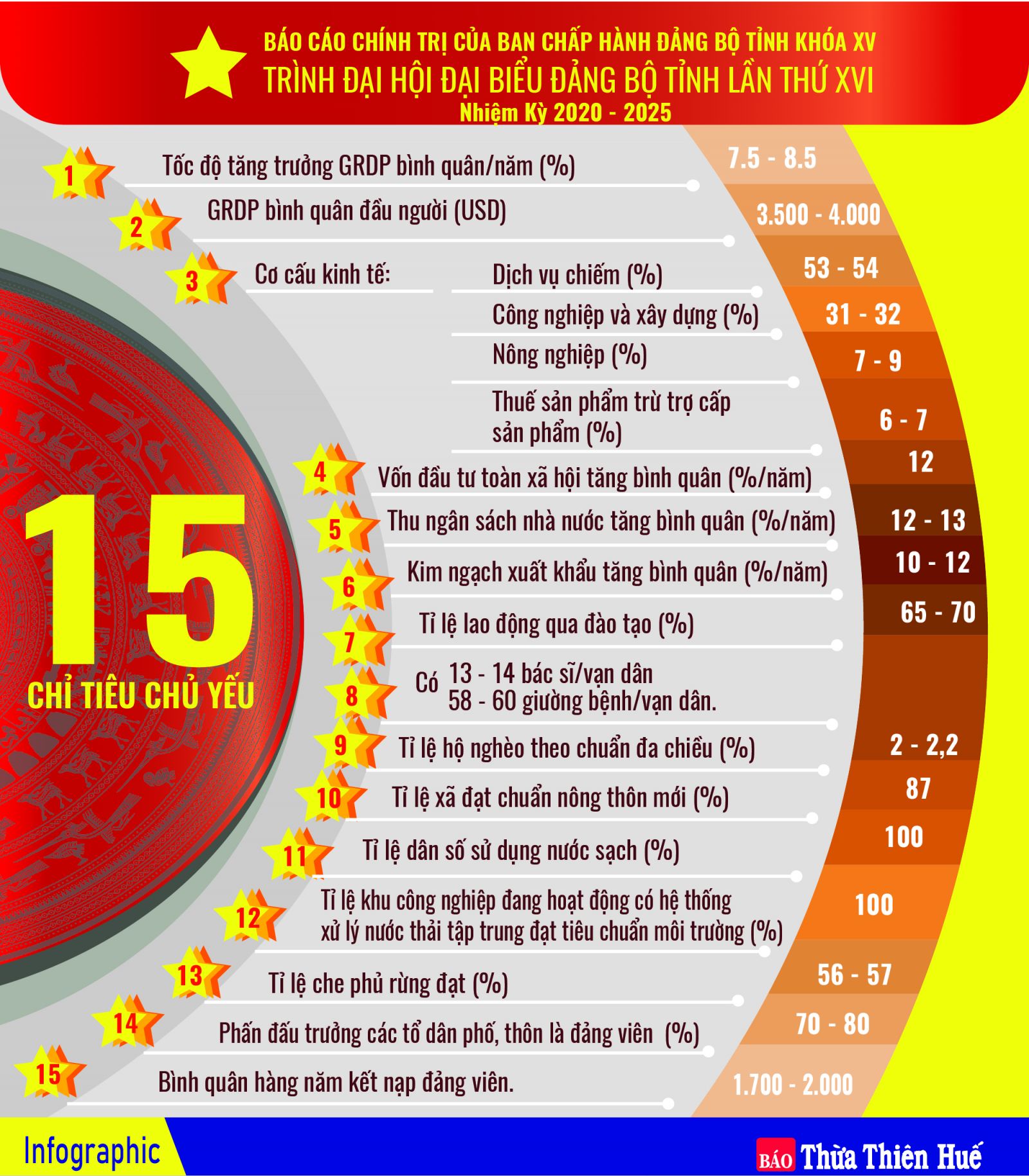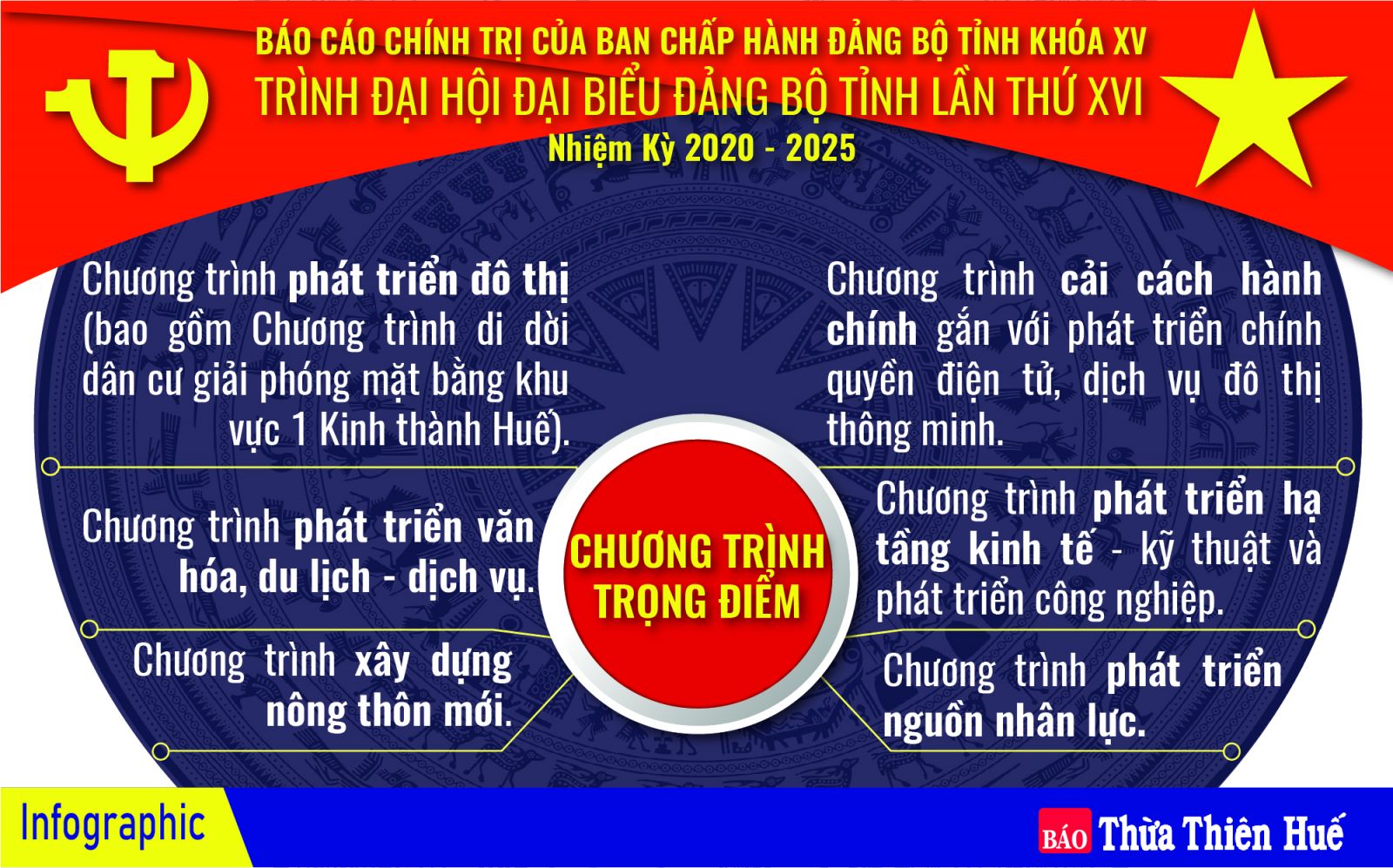 Có 15 chỉ tiêu kinh tế - xã hội đặt ra trong nhiệm kỳ mới 2020 -2025 và 6 Chương trình trọng điểm tập trung thực hiện. Đó là chương trình phát triển đô thị bao gồm chương trình di dời dân cư giải phóng mặt bằng khu vực 1 Kinh thành Huế; phát triển hạ tầng kinh tế, kỹ thuật và phát triển công nghiệp; phát triển văn hóa, du lịch, dịch vụ; cải cách hành chính gắn với phát triển chính quyền điện tử, dịch vụ đô thị thông minh; phát triển nguồn nhân lực, nhất là nguồn nhân lực chất lượng cao; xây dựng nông thôn mới gắn với giảm nghèo bền vững và phát triển kinh tế xã hội vùng đồng bào dân tộc thiểu số.