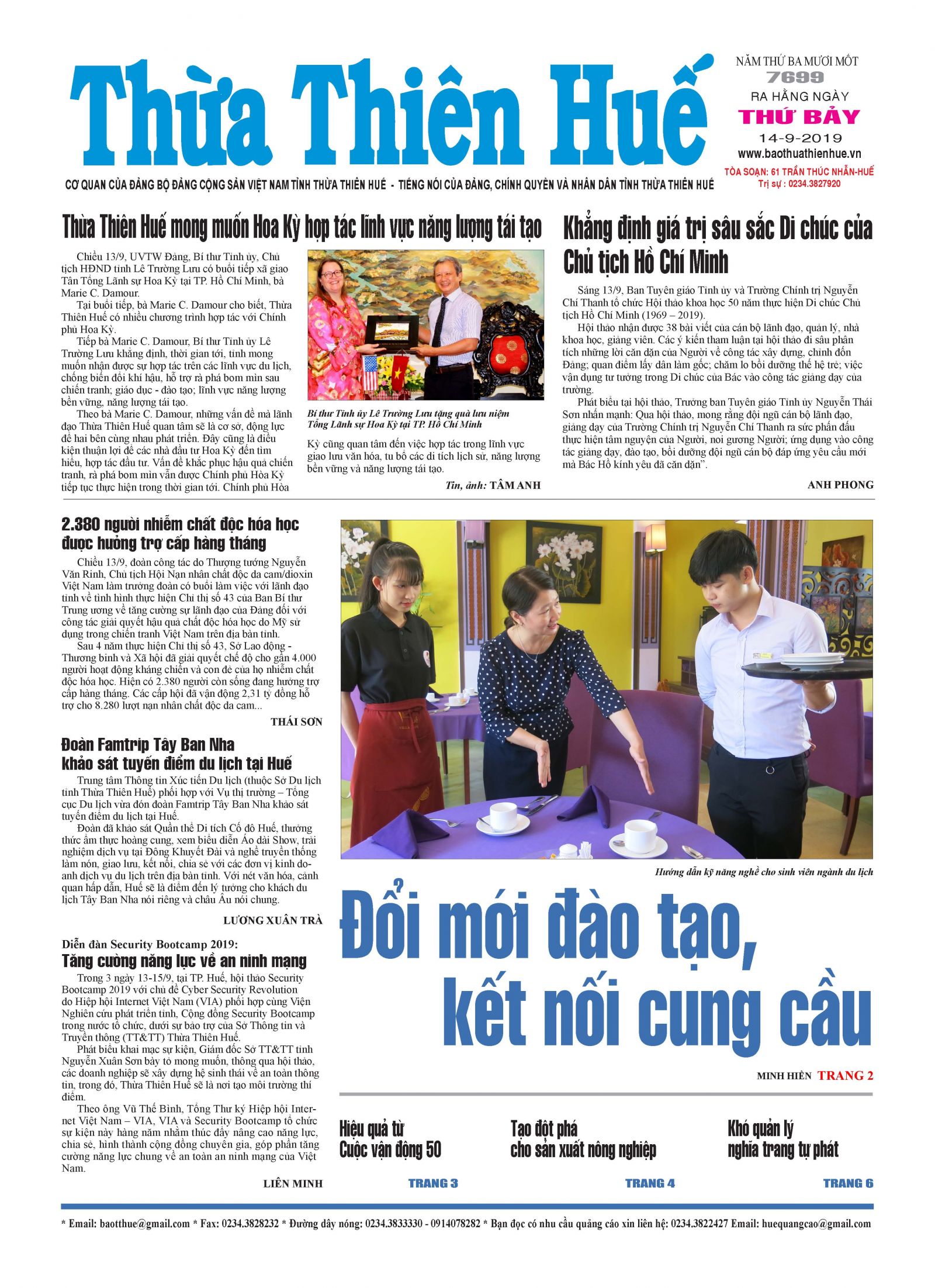 Báo Thừa Thiên Huế phát hành ngày 14/9 còn có các thông tin hấp dẫn trên trang nhất và trang 2, mục tin tức về buổi tiếp Tổng lãnh sự Hoa Kỳ tại TP.Hồ Chí Minh của Bí thư Tỉnh ủy Lê Trường Lưu; Thượng tướng Nguyễn Văn Rinh, Chủ tịch Hội nạn nhân chất độc da cam Việt Nam làm việc với lãnh đạo tỉnh về công tác giải quyết hậu qủa chất độc da cam; Đoàn famtrip Tây Ban Nha khảo sát tuyến điểm du lịch tại Huế; Thả cá thể rùa thuộc sách đỏ về môi trường tự nhiên…Đặc biệt, trên trang 2 có thông tin: Cá nuôi ở Thủy Tân, Thủy Phù chết hàng loạt chưa rõ nguyên nhân….