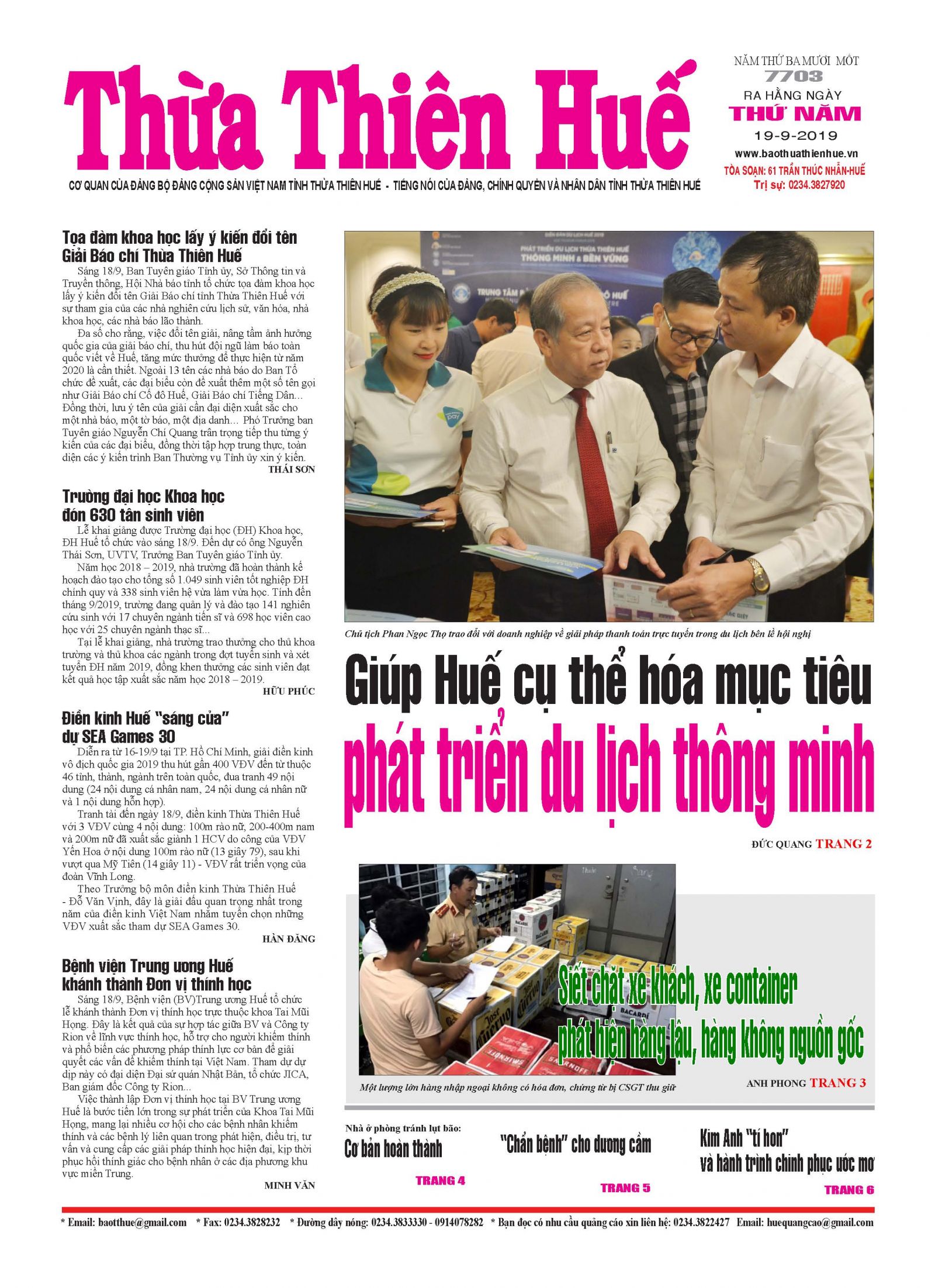 Trang nhất Báo Thừa Thiên Huế số 7703 ra thứ năm ngày 19/9/2019