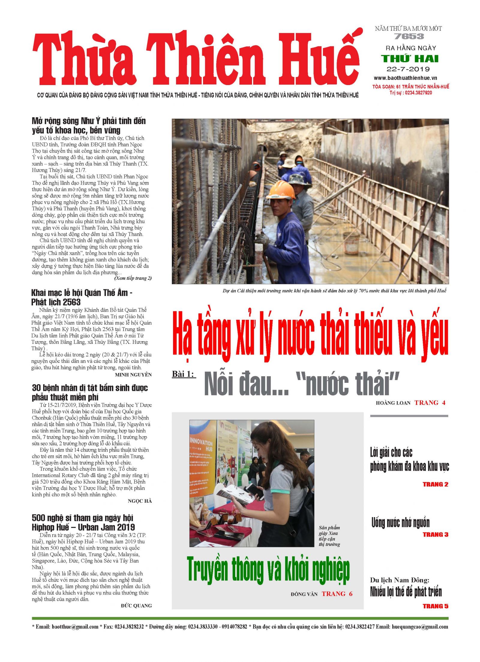 Báo Thừa Thiên Huế phát hành ngày 22/7 còn có các bài viết đáng chú ý về tiềm năng du lịch tại Nam Đông (trang 5), chương trình khởi nghiệp (trang 6) và thời sự quốc tế (trang 8).