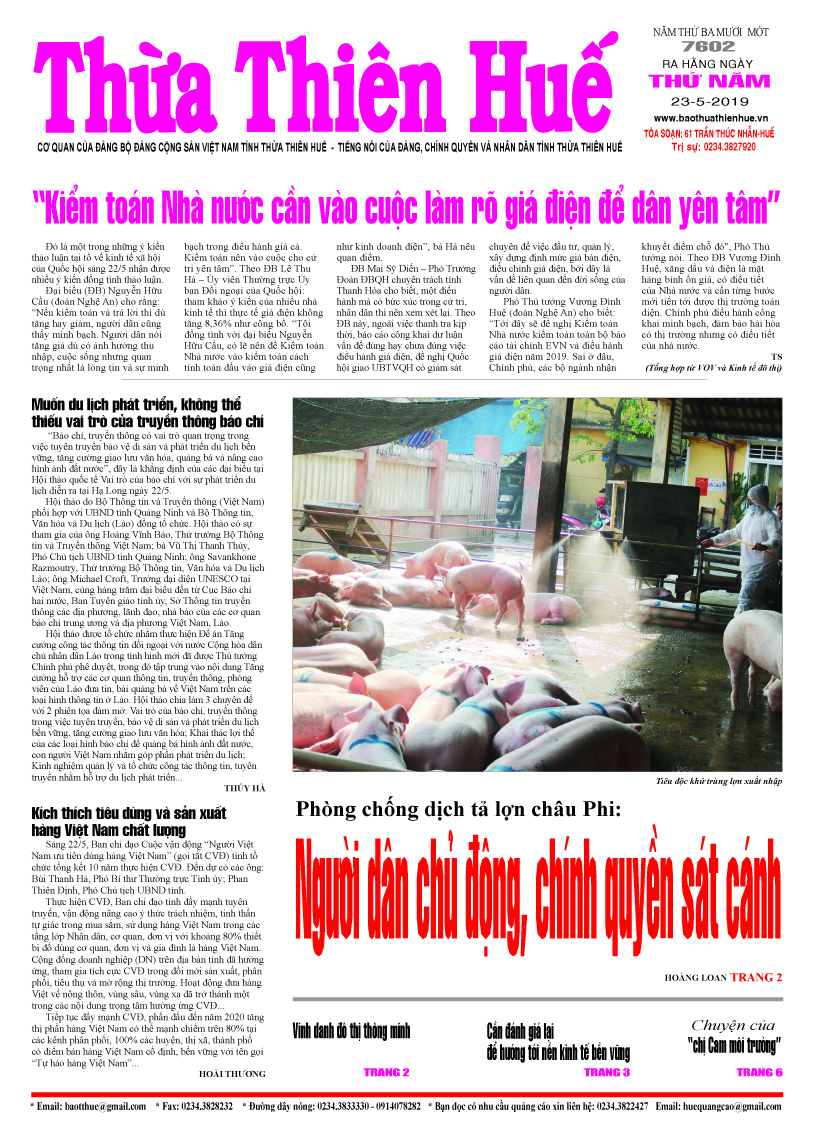 Trang chính và trang 2 có bài viết Chính quyền chủ động, người dân sát cánh. Cả hệ thống chính trị, người dân phải vào cuộc đồng bộ mới đẩy lùi được dịch tả lợn châu Phi (DTLCP)” là khẳng định của Bí thư Tỉnh ủy Lê Trường Lưu tại hội nghị trực tuyến với các huyện, thị, thành phố triển khai các giải pháp tích cực hạn chế DTLCP lây lan trong sáng 22/5.