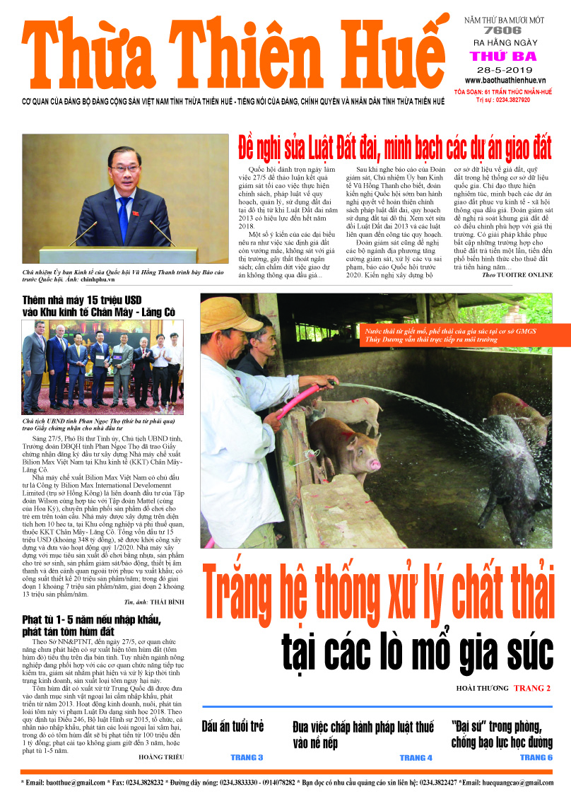 "Trắng" hệ thống xử lý chất thải tại các lò mổ gia súc ở vị trí vedette và trang 2 cho hay: Qua kiểm tra, lấy mẫu tại 11 cơ sở giết mổ gia súc (GMGS) trên địa bàn TP. Huế và các vùng phụ cận của Sở Tài nguyên & Môi trường, hầu hết đều không có hệ thống xử lý chất thải đảm bảo quy định. Thực trạng này dẫn đến việc ô nhiễm môi trường bởi hơn 90% cơ sở không đầu tư xây dựng hệ thống xử lý chất thải đảm bảo yêu cầu kỹ thuật và đúng quy định.