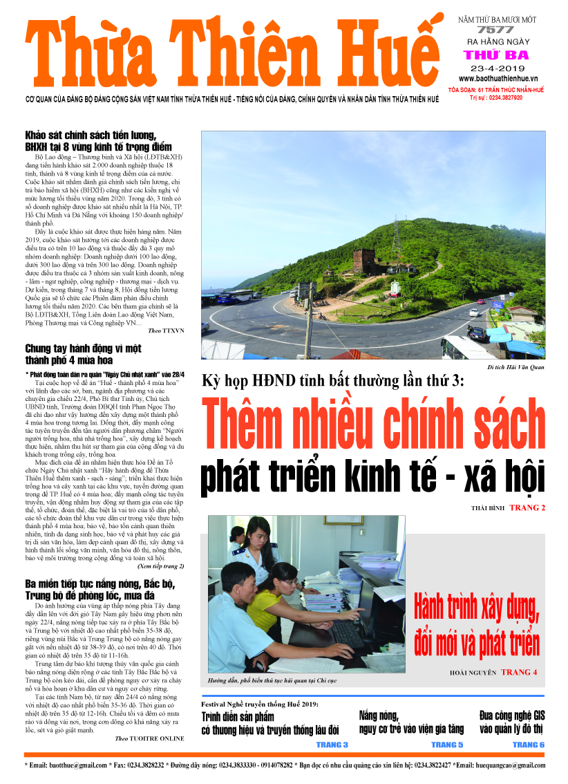 Một thông tin khác trong dòng thời sự chủ lưu về Festival Nghề truyền thống Huế (NTTH) có bài viết: Trình diễn sản phẩm có thương hiệu và truyền thống lâu đời trên trang 3. Festival Nghề năm nay được tổ chức từ ngày 26/4 đến 2/5, hội tụ 16 nhóm nghề: thêu, kim hoàn, mộc mỹ nghệ, đồng, gốm, nón lá, hoa giấy, thư pháp, tranh, diều, dệt - may, mây tre, pháp lam, nhang trầm, tinh dầu, lân - sư - rồng, các sản phẩm có thương hiệu và truyền thống lâu đời. Khác với 7 kỳ trước, Festival NTTH 2019 sẽ được tổ chức dài ngày hơn (kéo dài trong 7 ngày, từ 26/4 đến 2/5/2019, các năm trước chỉ kéo dài dưới 5 ngày). Bài viết còn giới thiệu nhiều hoạt động phong phú, hấp dẫn dành cho người dân và du khách trải nghiệm và khám phá…