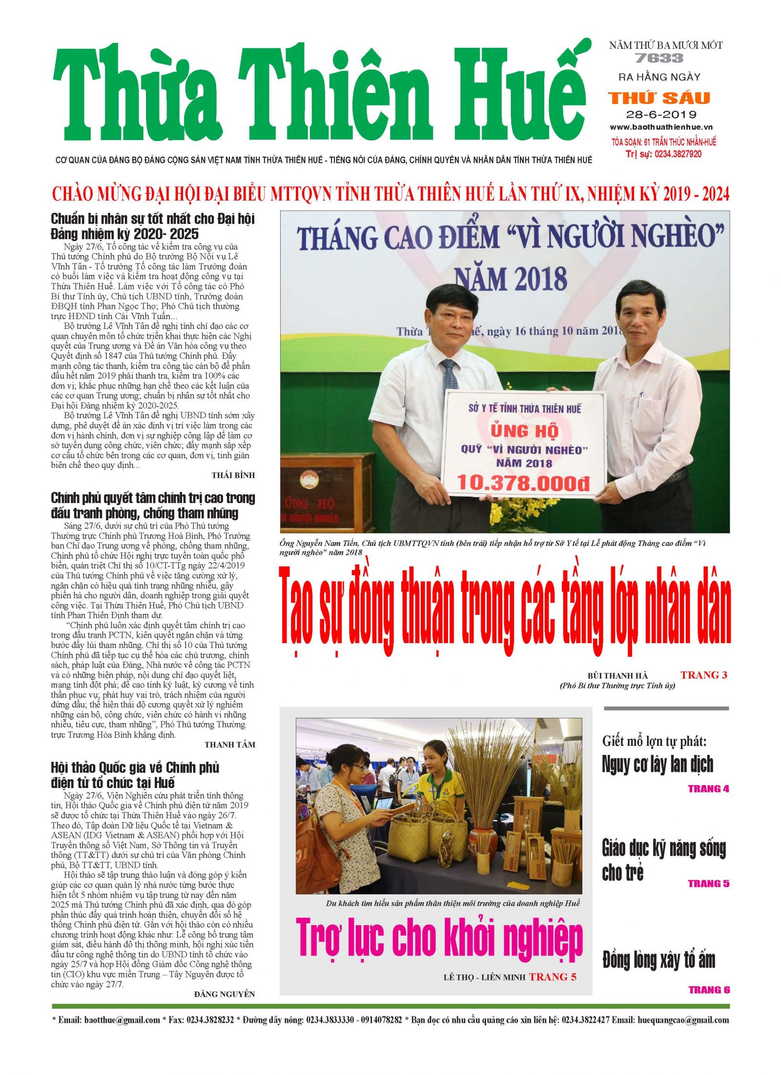 Trang 7 (bạn đọc), Quỹ Sen xanh của báo giới thiệu địa chỉ cần giúp đỡ. Đó là cụ Nguyễn Thị Khớt ở thôn 3, xã Thượng Nhật, huyện Nam Đông. Báo Thừa Thiên Huế số 7633 ra thứ sáu, ngày 28/6/2019 còn có các thông tin thời sự trong và ngoài nước… đáng quan tâm.