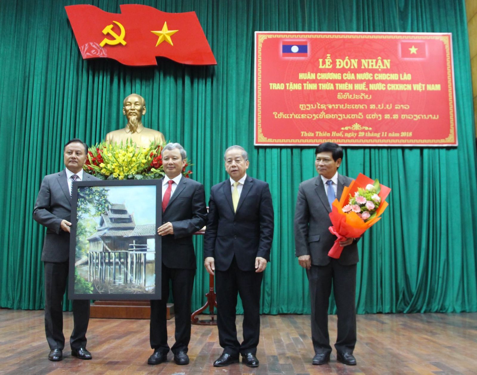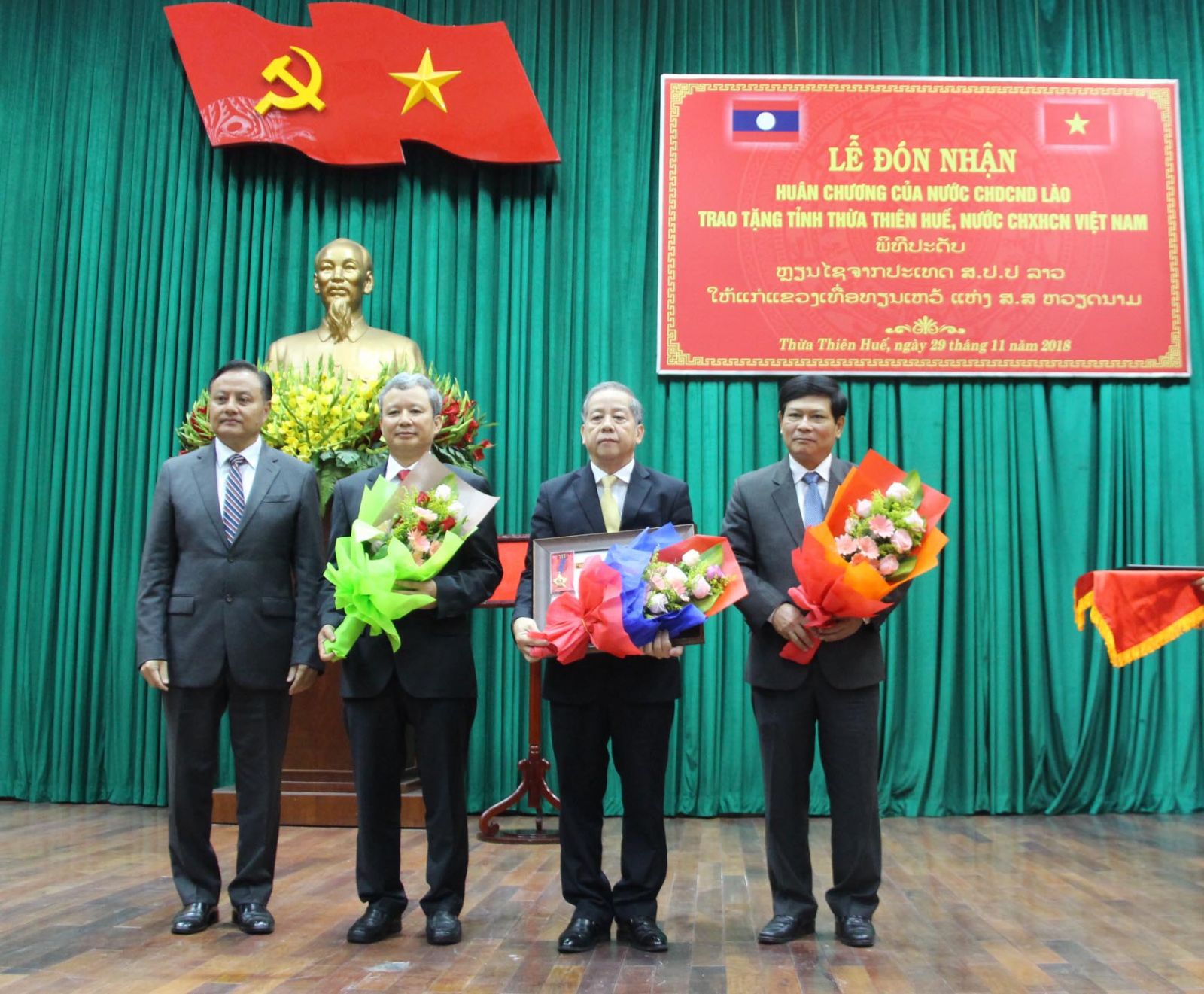 Ông Santyphap Phomvihan (ngoài cùng bên trái) thừa ủy quyền Chủ tịch nước CHDCND Lào trao Huân chương Lao động hạng Nhất đến lãnh đạo tỉnh Thừa Thiên Huế