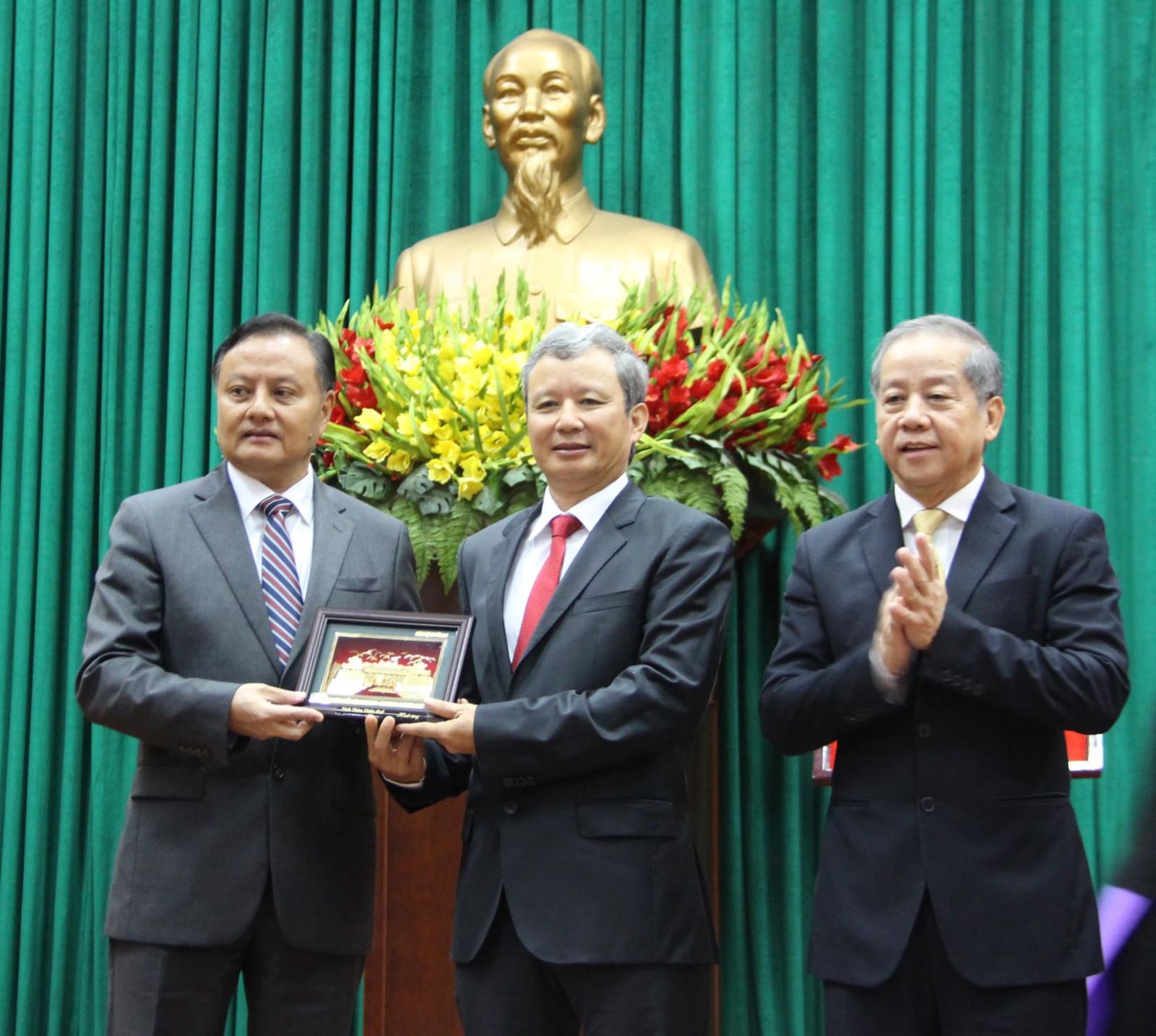 Bí thư Tỉnh ủy, Chủ tịch HĐND tỉnh Lê Trường Lưu (giữa) trao quà lưu niệm đến ông Santyphap Phomvihan