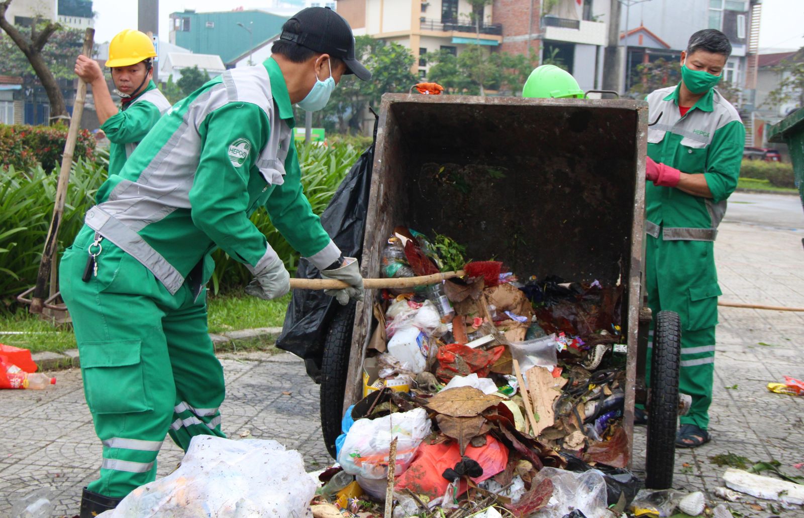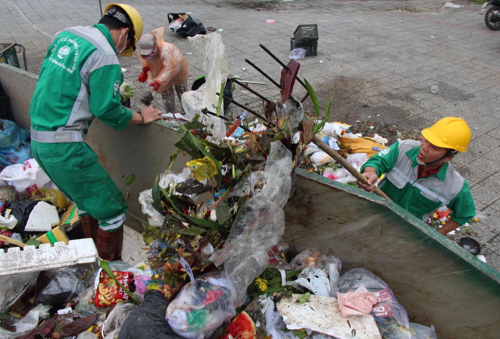 Một nhóm lao công thu gom rác, đưa lên thùng lớn chiều 30 tết