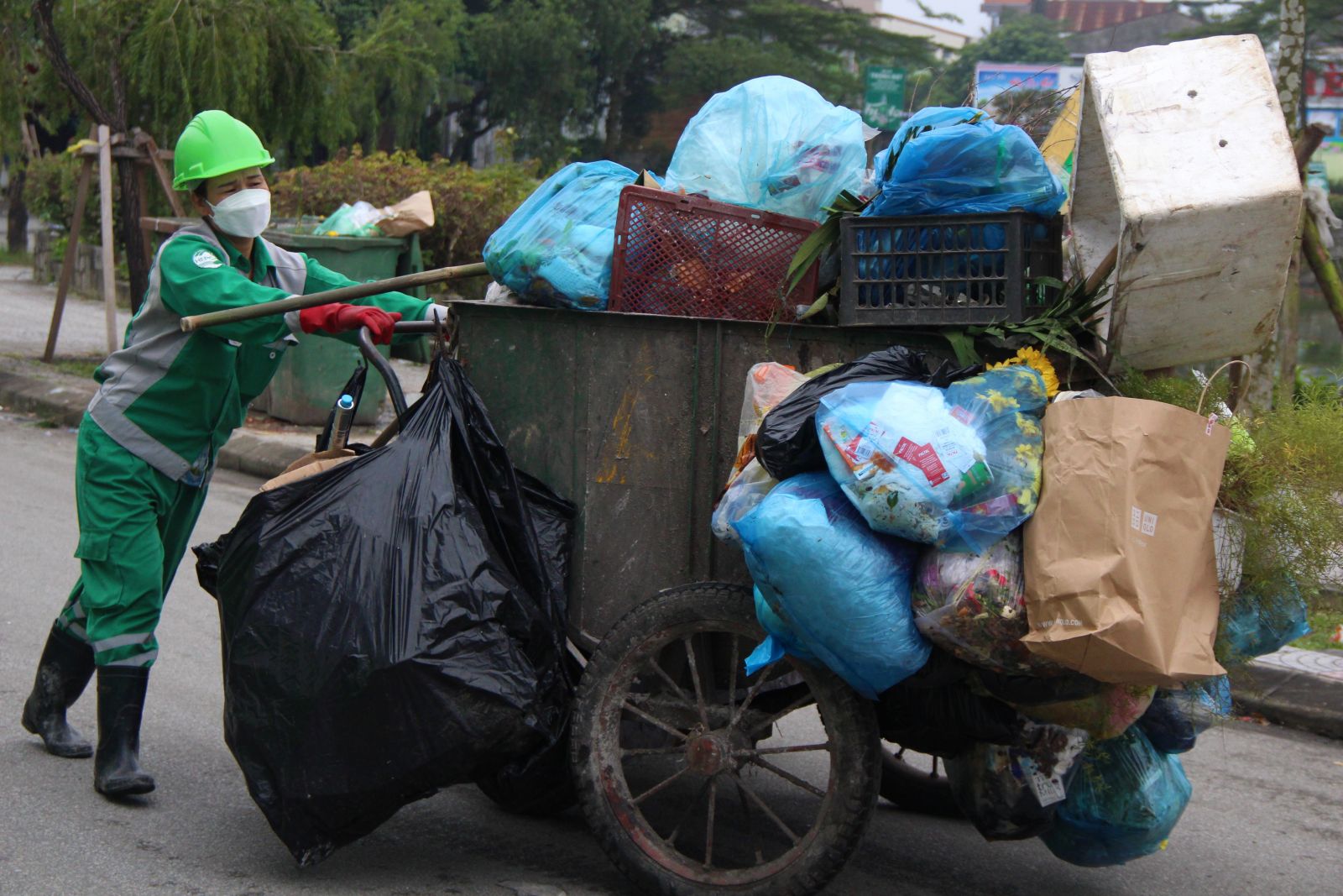 Chỉ trong sáng sớm, lượng rác thu gom đã nhiều hơn rất nhiều so với các ngày bình thường. Vừa kéo xe thu gom đi một đoạn đường ngắn, lượng rác thu gom đã chất cao hơn đầu người.