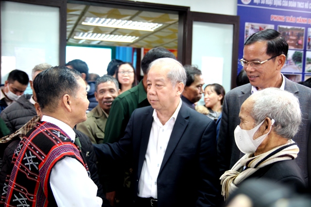 Phó Bí thư Thường trực Tỉnh ủy Phan Ngọc Thọ trò chuyện với các già làng, người có uy tín, trưởng thôn, tổ trưởng tổ dân phố của huyện A Lưới