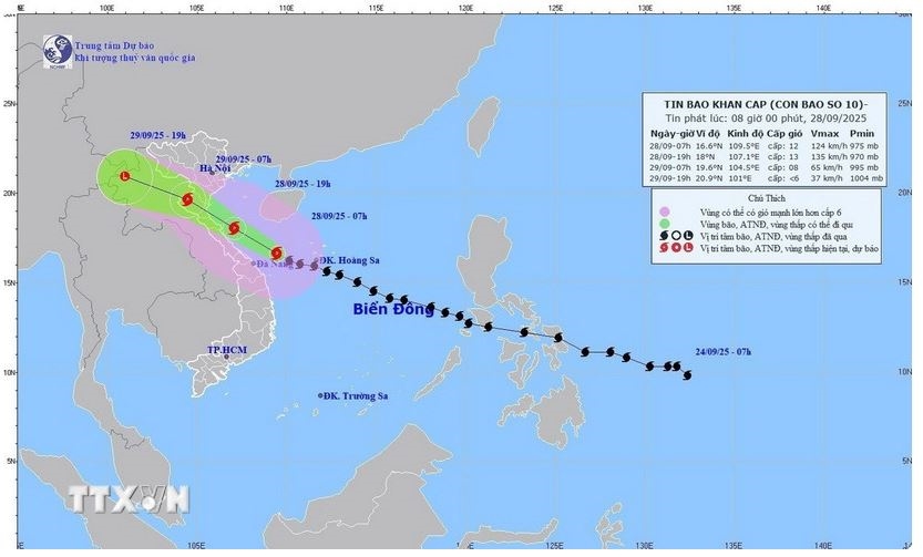 | Hướng di chuyển của bão số 10 lúc 7 giờ ngày 28/9. (Ảnh: TTXVN phát) |