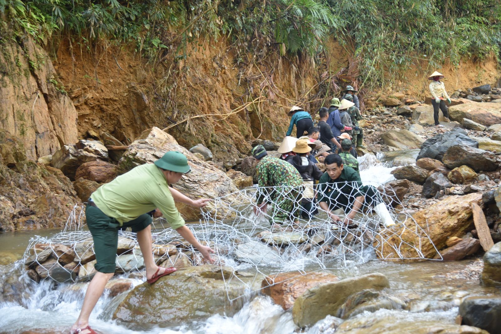 Cán bộ, nhân viên Đoàn Kinh tế - Quốc phòng 92 và bà con Nhân dân đắp đập, ngăn dòng làm hệ thống nước sạch