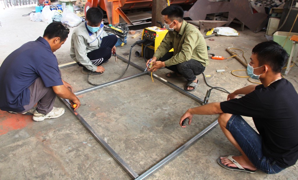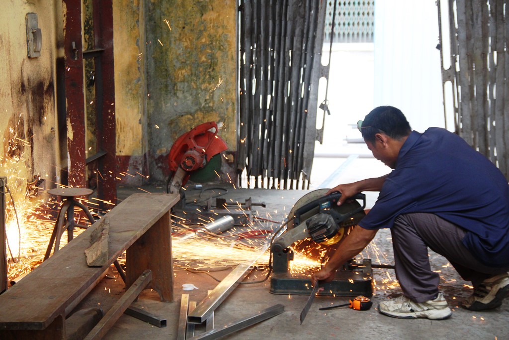 Để dựng nhà vệ sinh công cộng, công việc đầu tiên là đo, cắt sắt trước khi đấu nối lại với nhau