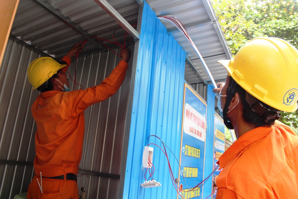 Các công nhận ngành điện đang giúp sức thiết kế đường dây điện cho nhà vệ sinh công cộng sao cho đảm bảo an toàn trong quá trình đưa vào sử dụng