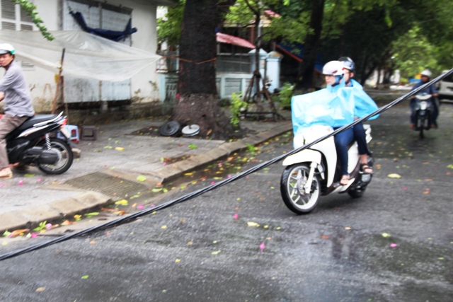 Nhiều người di chuyển gặp khó khăn do dây điện chắn ngang đường