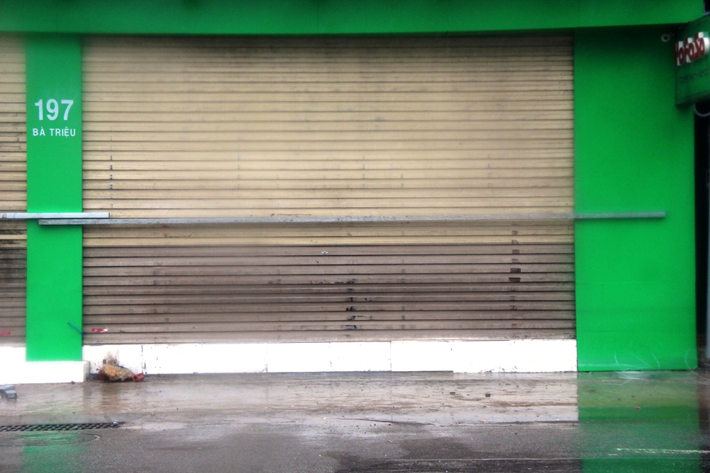 Một cửa tiệm trên đường Bà Triệu đã sử dụng thanh sắt lớn để nẹp vào hệ thống cửa cuốn, hạn chế thiệt hại khi bão đổ bộ