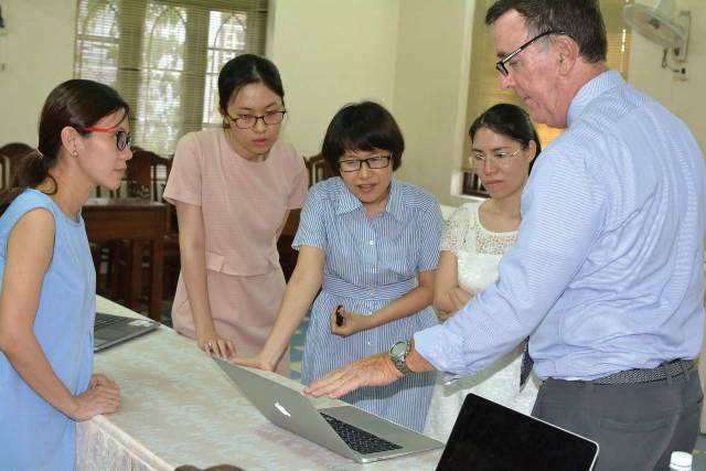 G.S Jay Craig Hartwell trao đổi về trang tiếng Anh với phòng Báo Thừa Thiên Huế Điện tử. Ảnh: Quang Thiều