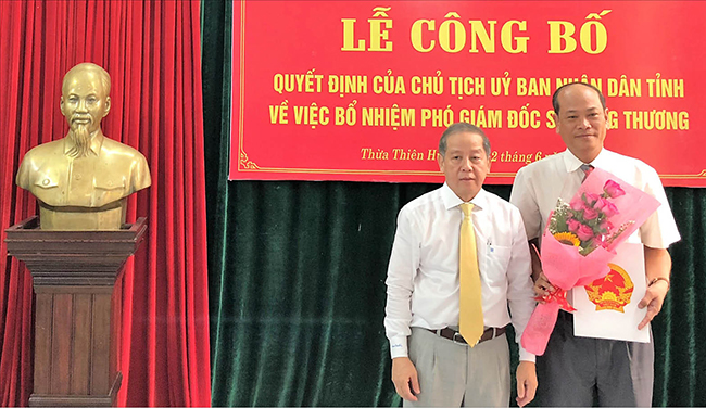 Chủ tịch UBND tỉnh Phan Ngọc Thọ (bên trái) trao Quyết định bổ nhiệm chức danh Phó Giám đốc Sở Công thương cho ông Nguyễn Lương Bảy