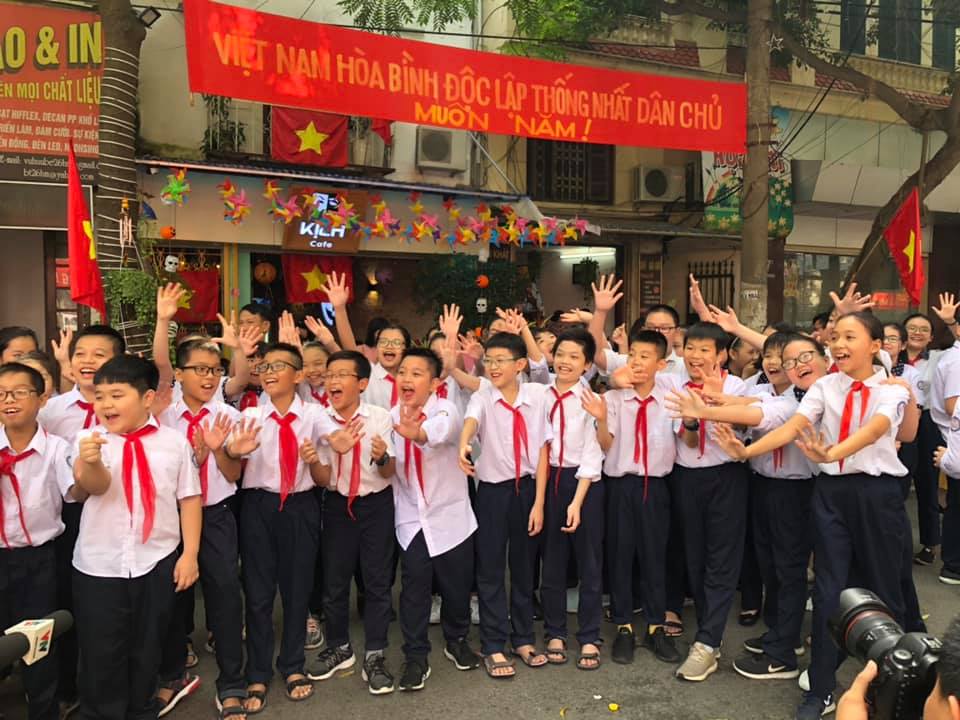 Các em học sinh Trường THCS Thanh Quan (Hoàn Kiếm) vui tươi khi được tham gia vào không gian “Ký ức Hà Nội - 65 năm”.