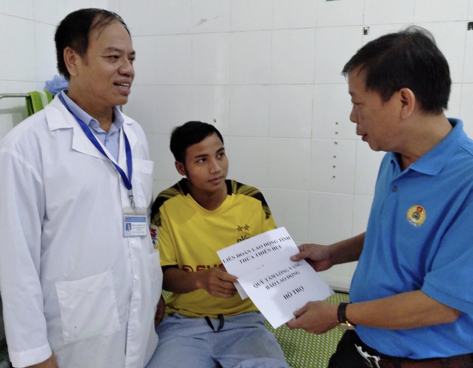 Phó Chủ tịch LĐLĐ tỉnh Trần Quang Vinh trao quà hỗ trợ cho công nhân gặp nạn