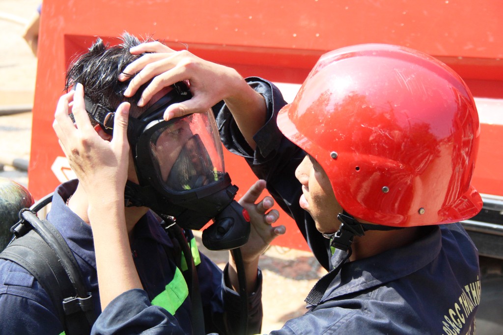 Chiến sĩ PCCC hỗ trợ trang bị bảo hộ trước khi vào chữa cháy