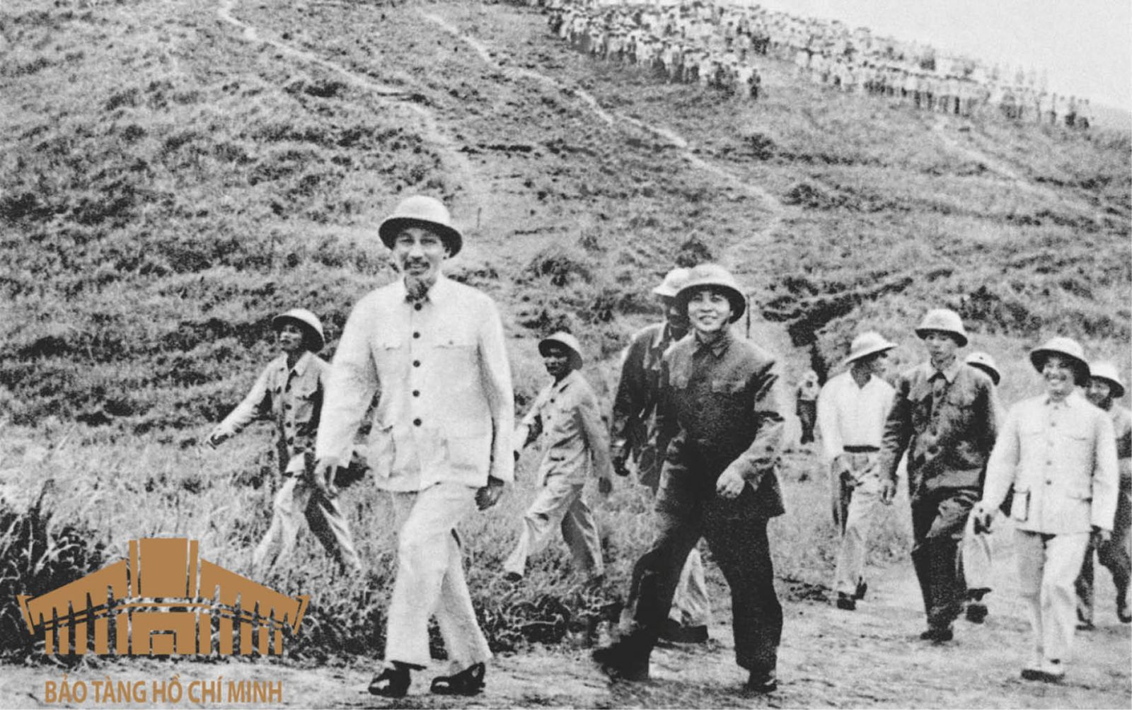 Chủ tịch Hồ Chí Minh thăm bộ đội diễn tập, năm 1950. Ảnh: Tư liệu BTHCM