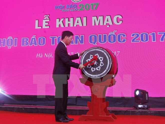Trưởng Ban Tuyên giáo Trung ương Võ Văn Thưởng đánh trống khai mạc Hội báo toàn quốc 2017. (Ảnh:: Thùy Dương/TTXVN)