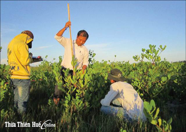 Phó Chi cục trưởng Chi cục Kiểm lâm tỉnh Phạm Ngọc Dũng trò chuyện, không như nhiều vùng đất ở miền Tây Nam bộ, Thừa Thiên Huế không có những bãi triều rộng nên việc trồng RNM chưa được “sướng”! Đất trồng manh mún, mỗi xã chỉ trồng được vài ha. Hơn nữa trồng RNM là hoạt động còn khá mới, nhiều đơn vị chưa có kinh nghiệm, nên chủ đầu tư là Chi cục Kiểm lâm tỉnh xem như “ôm trọn” từ khâu sản xuất, chuẩn bị cây giống, thiết kế cho đến tổ chức thi công, kiểm tra, giám sát… Do nước ngập thường xuyên, độ mặn thay đổi rất lớn, diện tích phân tán, nên quá trình thi công phải dùng nhiều giải pháp kỹ thuật.