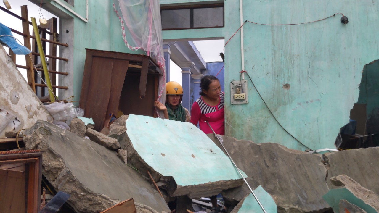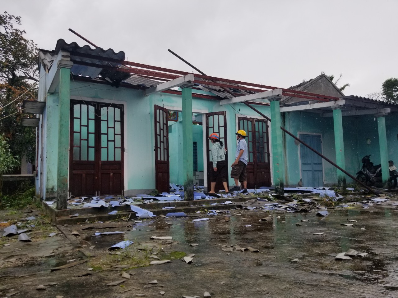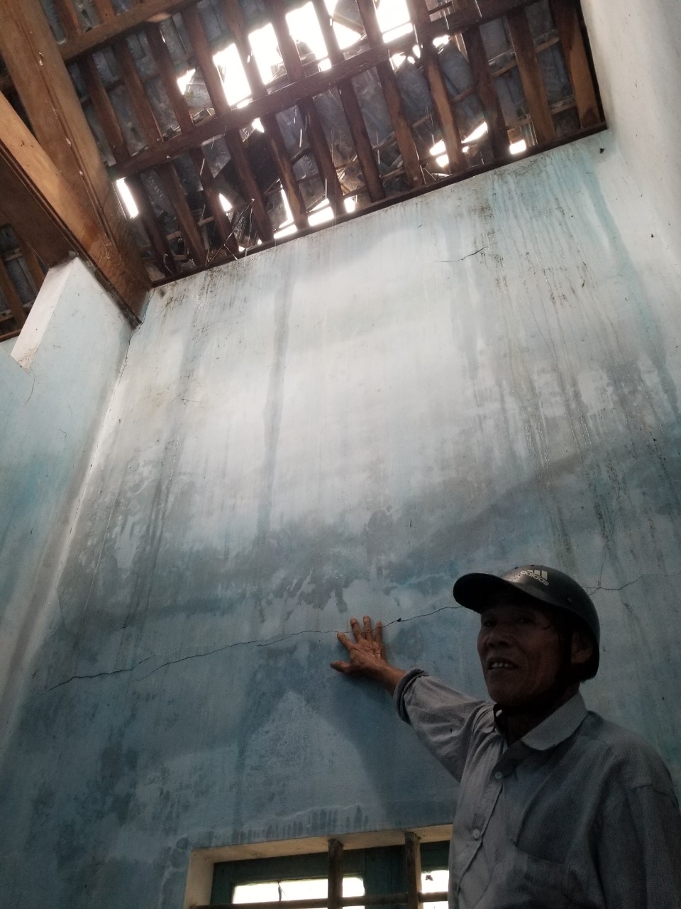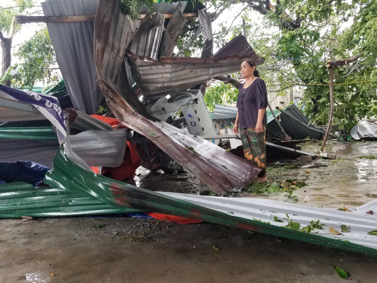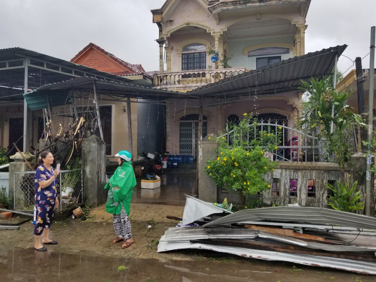 Nhà của vợ chồng ông Đinh Khắc Nhuận là một trong những trường hợp bị thiệt hại nặng nề nhất. “Cha tôi tai biến 10 năm nay. Mẹ tôi làm nghề buôn bán ớt khô. Theo kế hoạch của chính quyền địa phương, trước bão cha mẹ tôi sơ tán, nên không thiệt hại về người. Nhưng tài sản, riêng số ớt khô là đã thiệt hại tầm 500 triệu bị hư hỏng, chưa tính đến tường sập, mái tốc, các vật dụng khác hư hỏng.…”, con trai của ông Nhuận bật khóc và cho hay nhà anh cũng bị sập 1 căn nhà nhỏ, tốc mái căn nhà lớn.