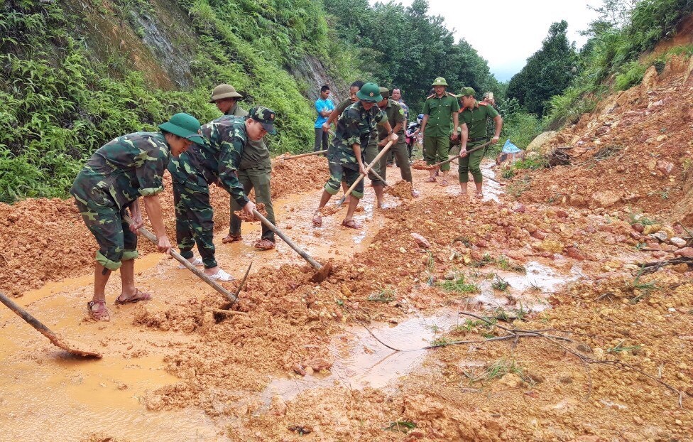Các chiến sĩ bộ đội biên phòng, công an cùng các lực lượng tiếp tục hỗ trợ khắc phục các tuyến đường bị sạt lở
