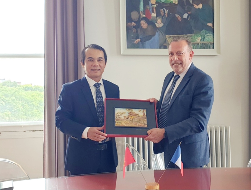 | Chủ tịch UBND TP. Huế Võ Lê Nhật (bìa trái) tặng quà lưu niệm cho Thị trưởng TP. Blois |