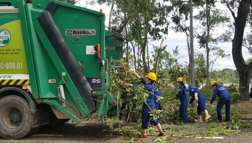 Công ty CP MTĐT Huế đang tạm thời cho lực lượng, phương tiện thu dọn cuốn chiếu cành cây, làm thông thoáng các tuyến đường, tạo điều kiện để người dân và phương tiện lưu thông thuận lợi. Kế hoạch trong một hai ngày tới sẽ tiến hành làm sạch vệ sinh cây cối gãy đổ và các biển bảng, áp phích bị hư hỏng… Đơn vị cũng huy động các bộ phận chuyên trách ra quân sớm sửa chữa, khắc phục hệ thống điện, đèn quảng cáo, các khu bãi xử lý rác thải, nước thải, nghĩa trang…