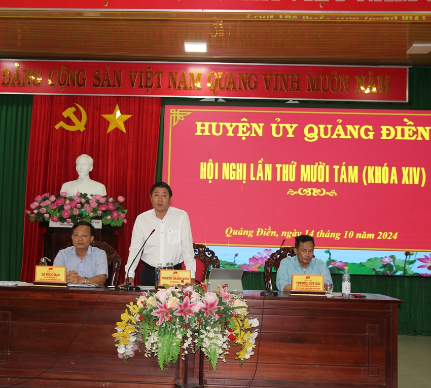 HNN.VN - Chiều 14/10, Huyện ủy Quảng Điền tổ chức hội nghị lần thứ 18 (khóa XIV) để triển khai nhiều nội dung quan trọng liên quan đến chỉnh trang đô thị; cơ cấu ngành nông nghiệp; đề cương chi tiết báo cáo chính trị, báo cáo kiểm điểm của Ban Chấp hành Đảng bộ huyện khóa XIV trình Đại hội đại biểu Đảng bộ huyện lần thứ XV, nhiệm kỳ 2025 – 2030.
