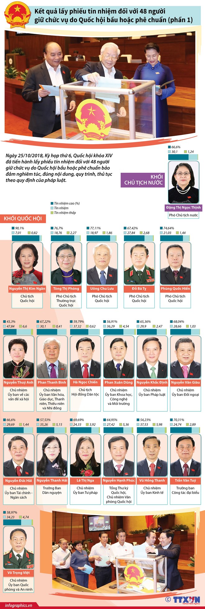 Ngày 25/10, Kỳ họp thứ 6, Quốc hội khóa XIV đã tiến hành lấy phiếu tín nhiệm đối với 48 người giữ chức vụ do Quốc hội bầu hoặc phê chuẩn bảo đảm nghiêm túc, đúng nội dung, quy trình, thủ tục theo quy định của pháp luật./.